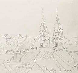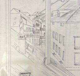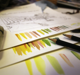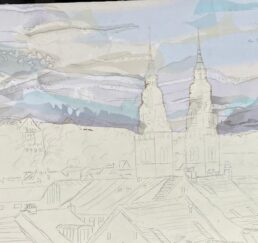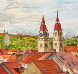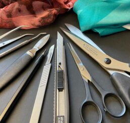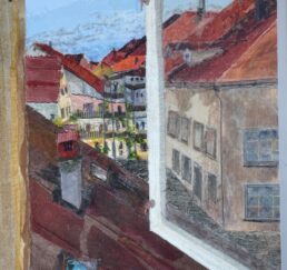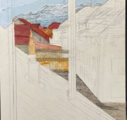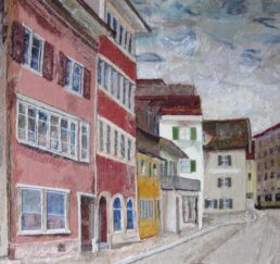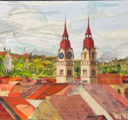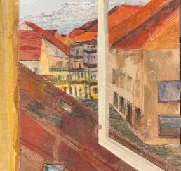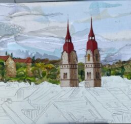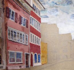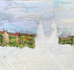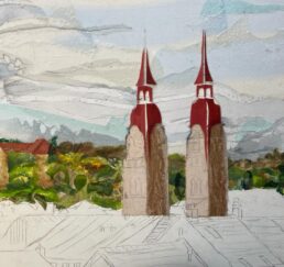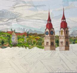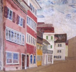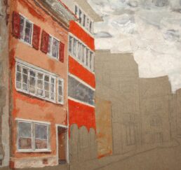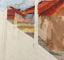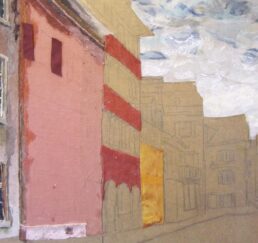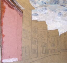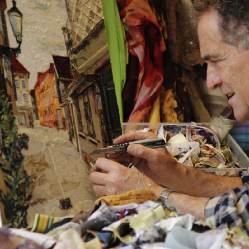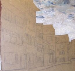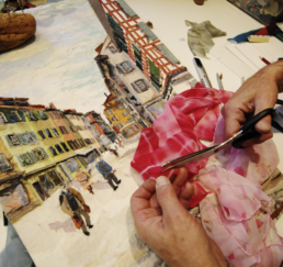 Vor Ort zeichne ich das Bild mit Bleistift und bestimme die Farben. In meinem Atelier sammle ich verschiedene gebrauchte Stoffe. In akkribischer Arbeit suche ich die passenden Farben und Stoffe für das Motiv und erstelle mit Skalpell, Schere und Leim die Textil-Collage. Hierbei benutze ich keine weiteren Hilfsmittel oder Farben. Die Geschichte jedes einzelnen Textilstückes findet so den Weg in das neue Werk.